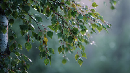 The Birch in light fog, dew on leaves, light soft diffused, three-quarter view