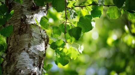 Close-up of a birch tree trunk with vibrant green leaves in a sunlit forest. The textured bark and fresh foliage create a natural scene, capturing the essence of a woodland environment.