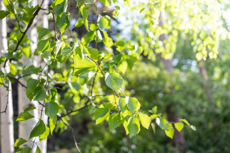 Birch branches with leaves lit by the sun. Green floral background.