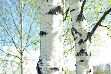 Young birch trees with black and white birch bark in spring against a blue spring sky.