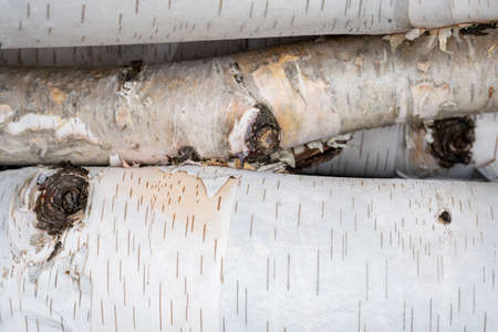 Logs from a birch tree and its branches, still covered in their white bark, are seen in a full-framed image showing their detail.