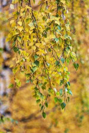 Autumn birch tree leaves background closeup. Creative photo. Autumn sunny beautiful day