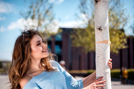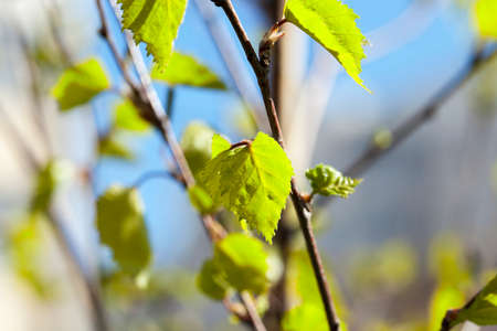 photographed close-up of a young birch tree green leaves on the background blue sky
