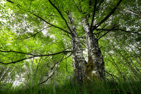 The beautiful nordic birch forest with fresh green grass and leaves. The detail of many black and white trunks during the sunny summer day.