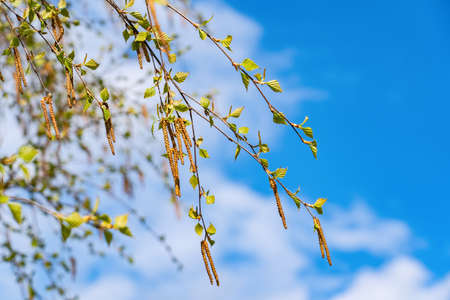 A birch branch in early spring against a blue sky, young birch leaves, buds and earrings. Selective focus