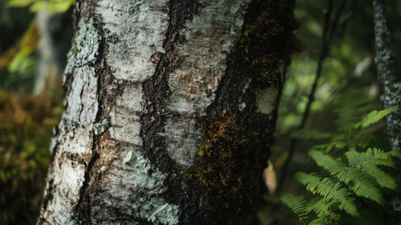 Close-up of a birch tree trunk with vibrant green leaves in a sunlit forest. The textured bark and fresh foliage create a natural scene, capturing the essence of a woodland environment.