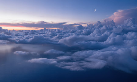Fluffy cumulus clouds stretching to the horizon under a dramatic twilight sky, with a crescent moon appearing above. expansive and tranquil aerial landscape.