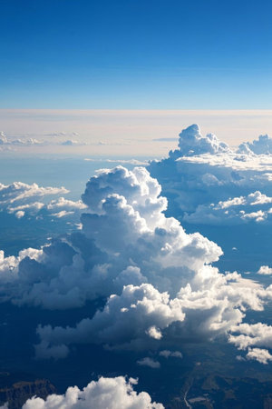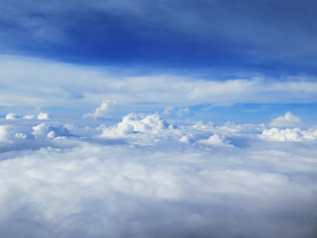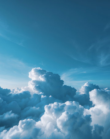 Beautiful aerial view of fluffy white clouds under a clear blue sky, symbolizing peace, freedom, travel, and natural beauty.