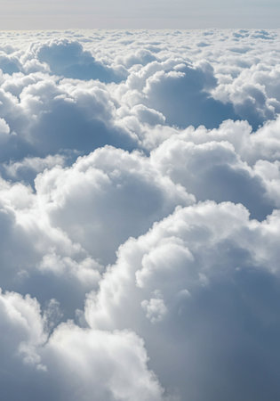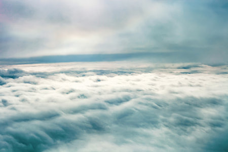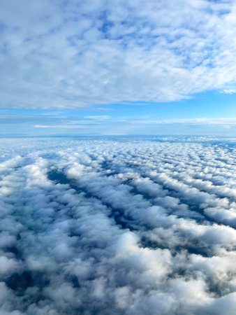 Aerial view from airplane window at high altitude of dense puffy cumulus clouds flying in evening