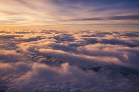 Purple showing dramatic sunset sky with golden luminous clouds and dark purple horizon layers viewed from above the...