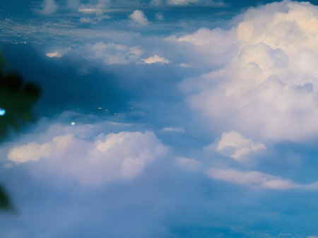 Clouds and sky as seen through window of an aircraft flying above the earth
