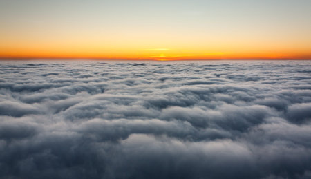 A panoramic view of a vast expanse of clouds illuminated by the warm glow of the setting sun
