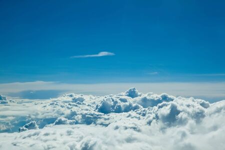 Clouds and sky as seen through window of an aircraft. Flying above the clouds