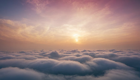 The sun is partially obscured by clouds, casting warm pastel light over a thick layer of mist that blankets the lower sky.