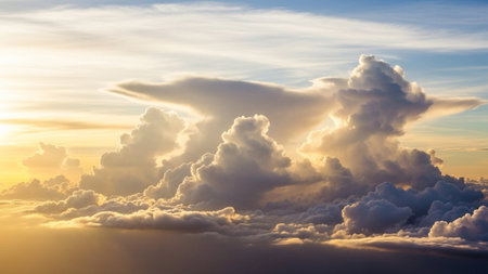 Dramatic cumulonimbus clouds illuminated by the golden light of a sunset, viewed from above the atmosphere with soft...