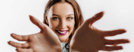 A beautiful young girl smiles, dreams and holds her hands near her face on a white isolated gray background. Place for advertising. Positive woman with fashion make-up with purple lips.