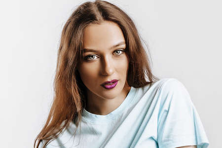 Beautiful young brunette girl with green eyes with long hair with fashion makeup with purple lips on an isolated gray background. The woman seriously looking at the camera. Kind cute model
