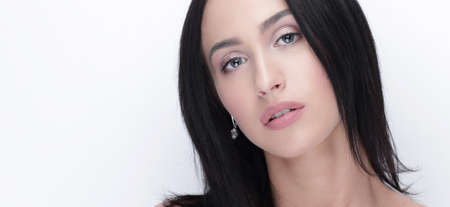Beauty portrait. Facial skincare. Aesthetic cosmetology. Brunette woman with perfect smooth face full lips looking at camera isolated on white copy space advertising background.