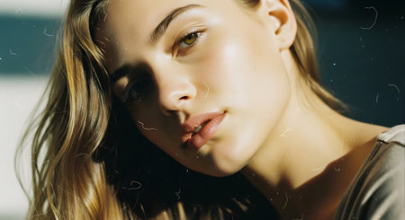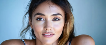 A young woman smiles gently showcasing her natural beauty. Soft lighting highlights her features creating a serene and inviting atmosphere. Her hair flows casually adding to her relaxed look.