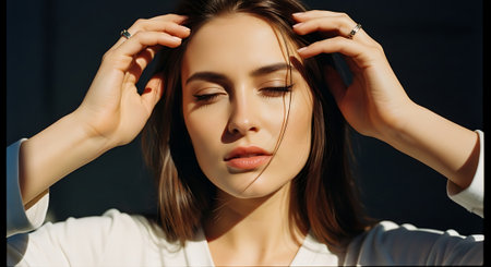 A serene young woman with her hands in her hair and eyes closed