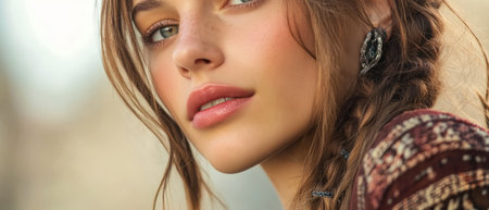 A young woman with beautiful braided hair and striking earrings gazes thoughtfully into the distance. Natural light illuminates her delicate features against a soft background.