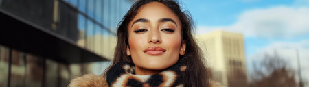 A woman stands confidently outdoors wearing a stylish outfit and scarf. She looks directly at the camera with a serene expression highlighting her poised demeanor in an urban setting.