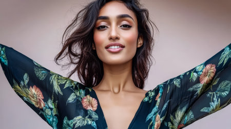 A woman stands confidently with her arms outstretched wearing a floral dress. She has a joyful expression with soft hair framing her face against a muted background.