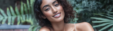 A joyful woman with curly hair sits comfortably surrounded by vibrant green plants. Her warm smile and relaxed demeanor create an inviting atmosphere perfect for enjoying natural beauty.