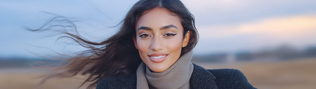 A woman stands outdoors with flowing hair in the wind smiling confidently. The background features a blurred landscape under a twilight sky. It evokes a sense of freedom and joy.