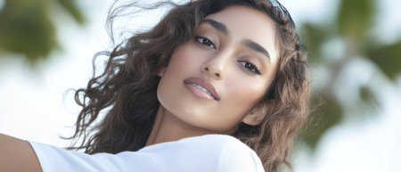 A young woman with curly hair smiles softly while enjoying a sunny day outdoors. Her relaxed pose and tranquil background create a serene atmosphere of beauty and confidence.