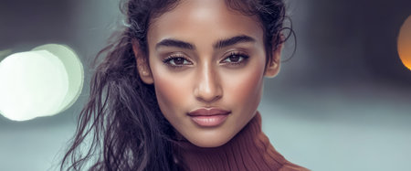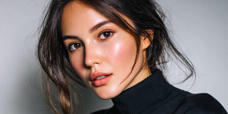 A confident woman is posing with a neutral expression while wearing a turtleneck. The background features soft lighting enhancing her features and creating a calm atmosphere.
