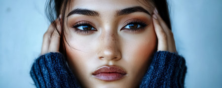 A woman in a cozy sweater holds her face gently with her hands showing a thoughtful expression. The soft lighting highlights her features creating a serene atmosphere in a natural environment.