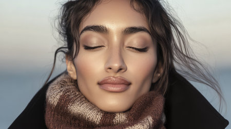 A woman stands by the ocean eyes closed and face serene adorned in a cozy scarf as the sun sets. The soft light highlights her features capturing a moment of tranquility and reflection.