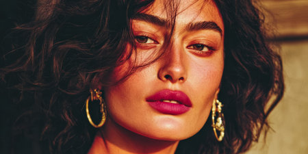 In a sunlit setting, a woman with voluminous curly hair and vibrant lipstick gazes directly at the viewer.