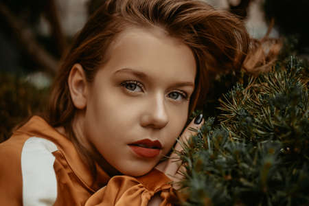 beautiful model on a background of wood, nature, greenery, spruce. Girl with short hair and a brown dress The blonde is lying on a tree, the model is posing fashionably.