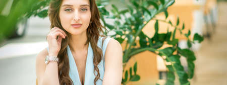 Beauty salon and hairdresser. Pretty girl with long brunette hair. Happy cute girl outdoor. Fashion portrait of sexy woman. Makeup cosmetics and skincare. Sexy beauty. Ambitious and beautiful