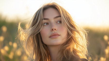 A young woman with beautiful long blonde hair and green eyes poses confidently outdoors. The warm natural light enhances her features, creating a serene and captivating atmosphere.