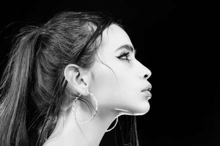 Woman with fashionable makeup on black background, copy space, close up.