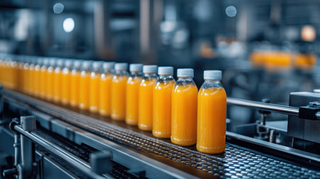 Orange juice bottles move along a conveyor belt within a modern, automated beverage factory. the well-lit production line efficient bottling process, adhering to high manufacturing standards with a focus on quality and productivity. Generative AI