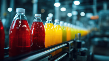 A captivating view of vibrant juice bottles on a production line, showcasing the modernization of beverage manufacturing with bright colors and advanced technology.