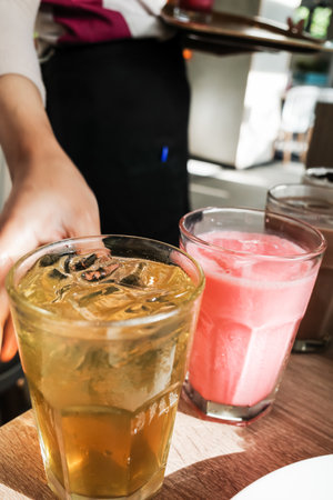 Tea and pink strawberry milk drinks served in glasses by waitress in a restaurant