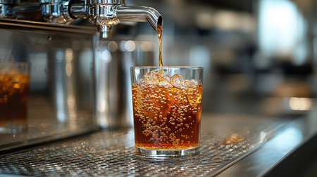 Nitro cold brew flows smoothly from sleek tap into clear glass Tiny bubbles rise, creating visually appealing display of texture and refreshment