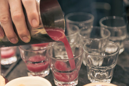 Red, strong alcoholic drink in small glasses on bar waiting to be served