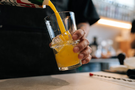 Bartender pouring juice in glass, preparing cocktails