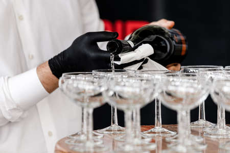 Hand with black glove pouring champagne in the restaurant . Waiter in black gloves poured champagne glasses on the wooden table. selective focus.
