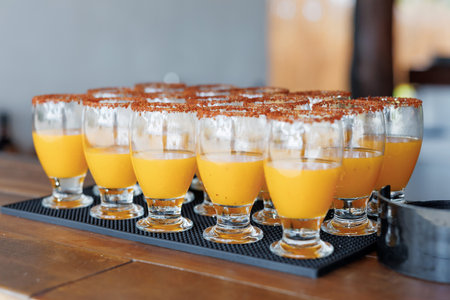 Fresh orange cocktails close up. Many summer cocktails lined up on a bar counter outside. Refreshing orange cocktails served in glasses with brown sugar on top. Perfect for a beach party and vacation