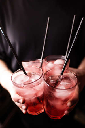The bartender's hand holds four glasses filled with fresh and cool cocktail, with a straw. close up