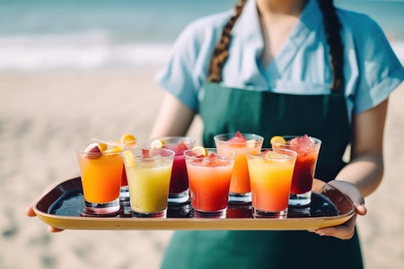 Close-up of a female waitress holding a tray of cocktails on the beach