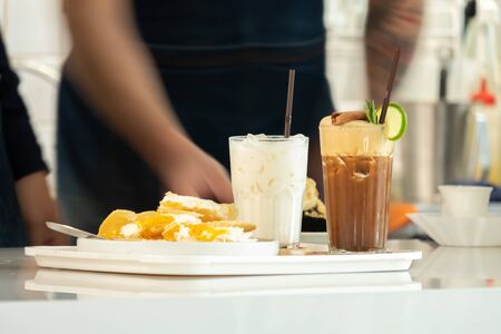 Beverage ordered by customers on the bar waiting to be served to customers
