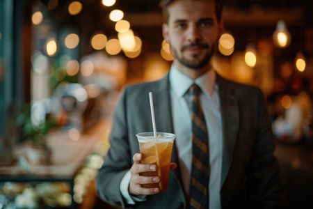 man in a cafe drinks a drink during a break